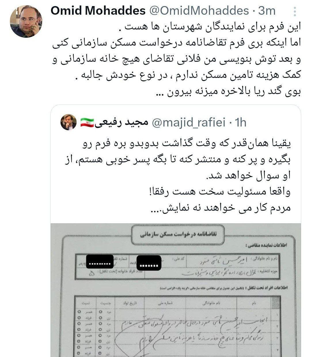 به گزارش روزن آنلاین، مجید رفیعی فعال رسانه ای، با انتشار فرم درخواست مسکن سازمانی امیرحسین ثابتی نماینده تهران در مجلس، در شبکه اجتماعی ایکس نوشت: