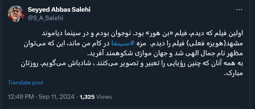 «اولین فیلمی که دیدم، فیلم «بن هور» بود. نوجوان بودم و در سینما دیامون مشهد (هویزه فعلی) فیلم را دیدم. مزه سینما در کام من ماند، این که میتوان مظهر نام جمال الهی شد و جهان موازی شکوهمند آفرید. به همه آنان که چنین رویایی را تعبیر و تصویر میکنند، شادباش میگویم. روزتان مبارک.»